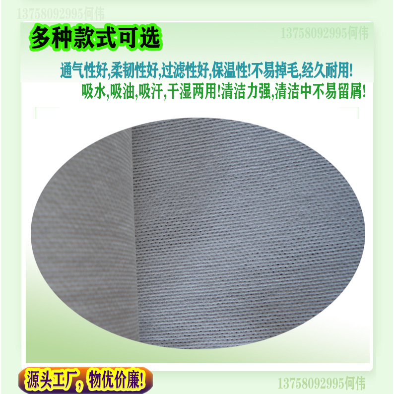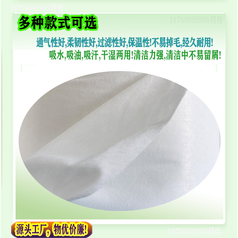 我司生產(chǎn)的環(huán)保無紡布抹布采用衛(wèi)生清潔的不織布,棉,竹纖維,人造棉纖維(或按照客人要求的材質(zhì)和顏色進(jìn)行配比)加工而成,是符合環(huán)保產(chǎn)品,具有衛(wèi)生、清潔、吸水性強(qiáng)、相對(duì)滌綸等化纖比較,無毒素、比較柔軟耐洗、不易生菌、有一擦即凈的功效。